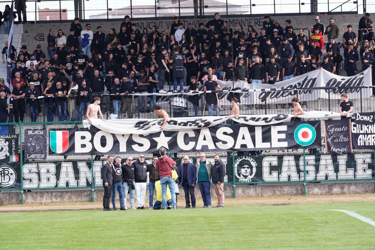 Casale M.to – Giornata-evento per i ragazzi del Casale 1909. Dopo aver reso omaggio al Camposanto al grande Umberto Caligaris, hanno ricordato il campione casalese indossando la maglia storica del “Caliga”, confezionata per l’occasione (anniversario numero 85 della morte) dal Museo Nerostellato e dalla Errea. Cerimonia in campo con tifosi ed istituzioni (targa e maglia donata dal club al nipote Umberto Trabaldo) e poi via, agli ordini della signora Matilde Bosco della sezione di Alba/Bra. Casale in campo con Rainero tra i pali; Miglietta, Mazzucco, Bullano, Mudaro in difesa; Spriano, Beatrice, Miceli a centrocampo; Simone e Mullici ad agire alle spalle di Vergnasco. L’Union Novara (squadra più giovane del girone) risponde con: Capetta, Locatelli, Fath Eddine, Brizio, Gagliano, Bruno, Aquilia, Astori, Burlone, Repossini, Riccardo Ferrari. L’ingresso delle squadre (accompagnate dai bambini della “cantera”) è sottolineato dalla splendida coreografia organizzata dai tifosi nerostellati, per suggellare nel migliore dei modi una giornata così importante. Partenza al fulmicotone dei casalesi, che sfruttano anche la logica empasse di una Union Novara giovane, catapultata in una cornice quantomai inusuale. Traversone di Simone dopo 47 secondi e colpo di testa di Beatrice che per poco non va a bersaglio. Fallo su Mullici al minuto 7 e punizione di Simone alta sulla traversa. Mullici punta l’area in verticale anche al 12’, concludendo da circa 18 metri. Capetta respinge, ma Vergnasco è lì, pronto per toccare in gol un pallone che aspettava da tanto tempo: 1-0. Il raddoppio del Casale arriva al 20’ ed è un piccolo capolavoro. Traversone millimetrico di Mullici sul destro di Simone, appostato sul palo opposto. Il primo tentativo è rimpallato, il secondo (sempre al volo) spedisce la palla all’incrocio dei pali: 2-0. Giallo per Locatelli al 23’ e assist perfetto di Vergnasco per Mullici al 26’: conclusione alta di poco. L’Union fa capolino nella metà campo di casa al 28’. Destro alto di Aquilia. Mullici da fuori area non trova il bersaglio al 32’ e un minuto dopo Vergnasco, solo davanti a Capetta, trova la respinta del portiere. Al 42’ bella azione in velocità tra Spriano e Simone, conclusa da una parata di Capetta. Nel recupero ci prova anche Mudaro. Tiro-cross bloccato sulla linea dal numero uno ospite. Al duplice fischio gli applausi del “Palli” sono meritati e convinti.