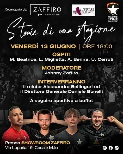 Casale Monf.to – Venerdì 13 giugno si è tenuto presso lo showroom della ditta “Zaffiro Serramenti”, un incontro con il mondo nerostellato. L’evento rientra nell’ambito di una serie di serate dove si parla di sport, arte e cultura, organizzate e presentate con maestria da Johnny Zaffiro. In quella che oramai è diventata una piacevolissima tradizione di fine stagione agonistica, si è parlato della prima squadra, del campionato 2024-25, del settore giovanile e dei progetti futuri del club. Tutto in un clima festoso, di amicizia, dove la parte “umana” della storia ha senza dubbio sopravanzato quella puramente tecnico-statistica. Perchè dietro alle quinte c’è molto di più e le grandi squadre si compattano nello spogliatoio, nelle serate trascorse insieme, nei consigli reciproci e nelle confidenze più segrete, che a volte non si fanno neanche tra le mura domestiche. Tutto ciò si chiama “magia da spogliatoio” ed è stato bello condividerla (ovviamente nel limite del possibile) con i protagonisti di una stagione straordinaria. Presente tutta la prima squadra, insieme allo staff tecnico, al Direttore Generale Dianiele Bonelli, in rappresentanza della dirigenza e al Direttore del settore giovanile Marco Defrancisci.